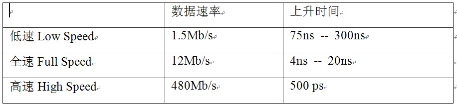 USB2.0是一種4線串行系統(tǒng),包括VBus,D-,D+和地線,D-和D+是數(shù)據(jù)傳輸線,VBus和地線傳輸5V電壓。按照功能的不同,USB2.0產(chǎn)品可分為主機(jī)(Host)、設(shè)備(Device)和集線器(Hub)三大類。還可以根據(jù)供電方式的不同將USB2.0設(shè)備分為總線供電(從主機(jī)汲取電流)和自供電兩種方式。為了適應(yīng)不同類型應(yīng)用對數(shù)據(jù)傳輸速度的要求,USB2.0定義了三種速率級別,分別是: