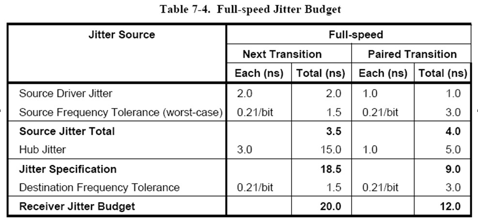USB2.0是一種復(fù)雜的總線結(jié)構(gòu),既包括高速、全速、低速三種速率級別,也包括主機(jī)、設(shè)備、集線器三類產(chǎn)品,每種類別又包括多個參數(shù)需要測試,幅度、抖動、時序、過程等特性都需要一一分析是否滿足規(guī)范要求。USB2.0一致性測試規(guī)范對HighSpeed的Device分析就定義了幾十個參數(shù)。每一種參數(shù)的測量對于示波器的使用都定義了設(shè)置參數(shù),如下1就是USB-IF對全速抖動測試的容限范圍規(guī)定: