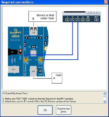 QualiPHY軟件的用戶界面設(shè)計(jì)非常人性化和直觀實(shí)用,它會以圖表化的方式顯示出一致性測試的每個環(huán)節(jié)中測試夾具、示波器主機(jī)和DUT三者之間的拓?fù)潢P(guān)系,使用者無需記憶,就能正確設(shè)置測試環(huán)境。下圖4清晰 顯示了USB2.0高速設(shè)備信號質(zhì)量測試中的夾具、DUT和示波器連接關(guān)系。