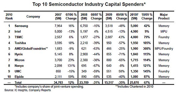 市場研究公司IC Insights預計,今年半導體產業資本支出中的2/3將由支出前十位的公司包攬,包括Samsung、Intel、TSMC和Toshiba。今年支出前十位的廠商的投資總額預計增長67%,而產業整體支出增長額預計為51%。