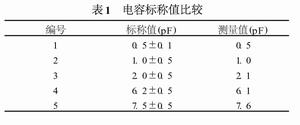現(xiàn)對5個標稱值已知的片式電容在300M~3000MHz的頻率范圍內(nèi)測量,所得數(shù)據(jù)與生產(chǎn)廠家給出的電容標稱值進行比較,如表1所示。