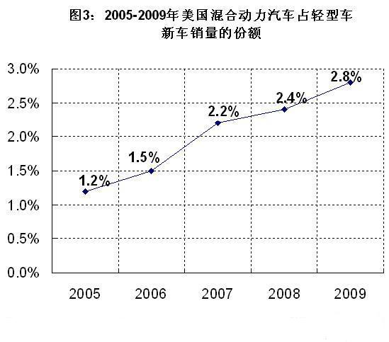 - 混合動力汽車銷量中的份額從2005年的1.2%逐漸上升至2009年的2.8%