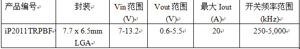 iP2010的輸入電壓范圍為7V至13.2V,輸出電壓范圍則為0.6V至5.5V,輸出電流高達(dá)30A。這個(gè)器件最高運(yùn)行頻率為3MHz。在5MHz運(yùn)行時(shí),與iP2010引腳兼容的iP2011備有相同的輸入和輸出電壓范圍,但后者經(jīng)過優(yōu)化,從而使最高輸出電流高達(dá)20A。通過以通用占位面積提供多種電流額定值器件,IR提供的靈活性能夠滿足不同客戶對電流水平、性能和成本的要求。