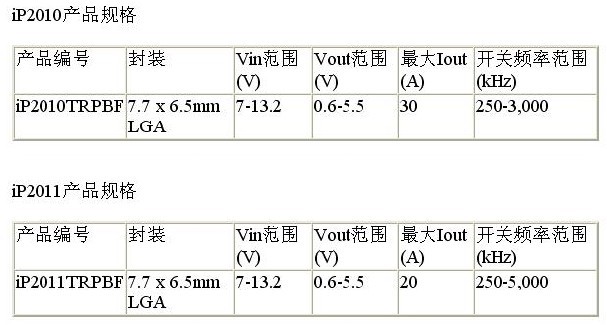 iP2010的輸入電壓范圍為7V至13.2V,輸出電壓范圍則為0.6V至5.5V,輸出電流高達30A。這個器件最高運行頻率為3MHz。在5MHz運行時,與iP2010引腳兼容的iP2011備有相同的輸入和輸出電壓范圍,但后者經(jīng)過優(yōu)化,從而使最高輸出電流高達20A。通過以通用占位面積提供多種電流額定值器件,IR提供的靈活性能夠滿足不同客戶對電流水平、性能和成本的要求。