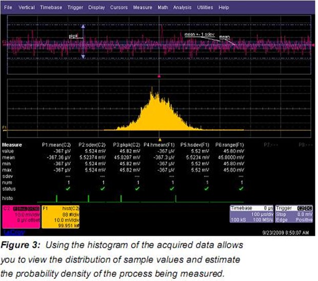 噪聲呈高斯分布,平均值和標準方差用來描述噪聲的概率密度函數(pdf)。直方圖提供了測量參數分布的簡單視圖。Figure 3 顯示了采集樣本值的直方圖。該直方圖為用戶提供了帶有被測過程的概率密度函數的估計。這個數據可以使用直方圖參數解釋。Figure 3 顯示了3個直方圖參數,hmean,hsdev,和range,分別是平均值,標準方差,范圍的直方圖分布。直方圖可由單次采樣或多次采樣計算出來。這兩種情況都能提供被研究過程的大量本質認識。這個例子中的偽高斯分布表明信號源是一個隨機過程。