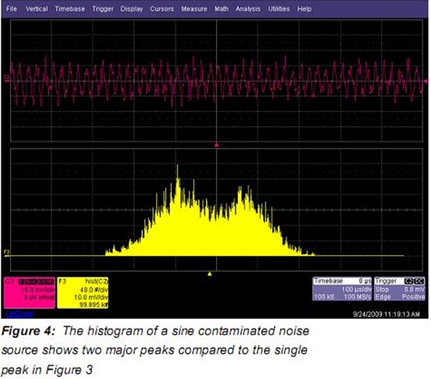 Figure 4 的直方圖稍有不同。分布的寬度增加了并且有2個峰。這是由于原本的隨機噪聲中存在小的正弦分量而引起的。正弦波分布有2個峰并且2個混合波形圍繞著構成波形的分布。通過觀察分布的形狀可以了解被測過程發生了什么。在開始任何測量之前觀察噪聲分布無疑是一個好的實踐。