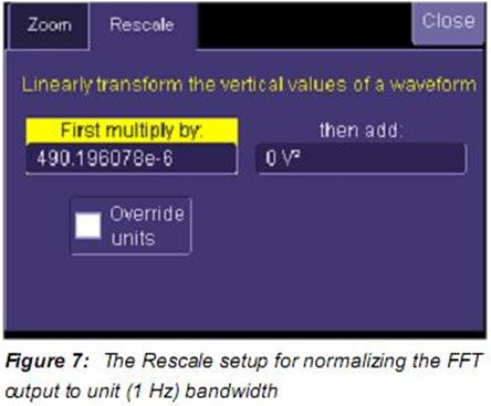 平均FFT輸出要歸一化到等效FFT帶寬。此外,還有其它刻度也要提到。力科示波器的FFT輸出校正到峰值讀數而不是有效值。要轉化為有效值,FFT幅度必須乘以0.707而幅度的平方值要乘以0.5。FFT值除以等效帶寬是為了歸一化到1Hz帶寬。Figure 7中顯示了重標刻度功能。重標刻度功能允許用戶通過乘一個系數重標刻度并增加或減去偏移。該處,乘以 05/102=490 E-6。系數0.5前面討論過,另一個系數是等效FFT帶寬的倒數,等于?f乘以如Figure 6中所示的ENBW。如果加權函數不是矩形則ENBW的值將大于1。
