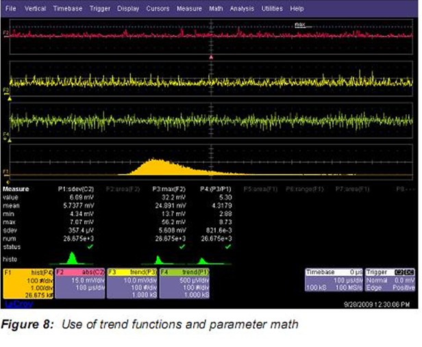 參數統計包括最小和最大值。如果想查看采集接著采集的參數變化可以使用趨勢功能。趨勢繪出了每個測量值vs 順序事件數的變化。Figure 8中顯示的函數跡線F4就是參數P1的趨勢。P1是通道C2的標準方差。標準方差參數每一次采集產生一個值,而F4順序顯示測量到的每一個讀數。趨勢圖可以看成一種任意波形,可以使用任何數學或測量工具對其分析。