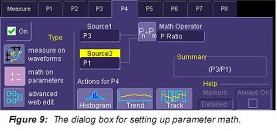另一個關注的噪聲參數是峰值系數,峰值對有效值的比率。這個決定動態范圍的參數需要處理信號中的峰值變化。示波器沒有雙“峰”參數,但可以通過采用通道 C2的絕對值從而創建一個。將負值“翻轉”到波形的正上方以便用戶使用參數最大值讀取每個采集最大的正或負峰值。注意該處理因為信號具有0平均。使用參數數學計算峰值系數。參數數學設置如Figure 9所示,計算P3對P1的峰值系數P4。Figure 8中所示峰值系數平均值為4.3。