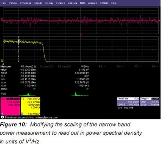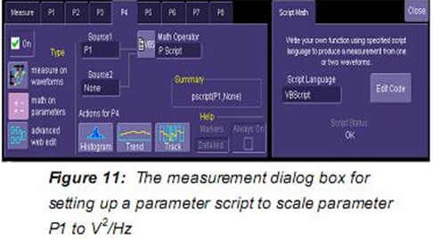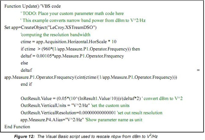 另一個進行噪聲“點”測量的方法是采用可選的窄帶功率測量。窄帶功率(nbpw)通過計算給定頻率上的離散傅里葉變換測量功率。Nbpw的單位是dBm。噪聲測量不太方便,我們希望用噪聲功率譜密度線性單位V2√Hz來進行測量。幸運的是,力科示波器可以用腳本使用參數數學修改測量。這允許更復雜的計算而不是Figure 9所示的參數的簡單比率峰值系數。