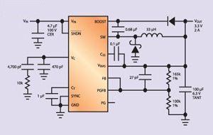 在猝發(fā)模式下,它的靜態(tài)電流低于100礎,適合輸入電壓為12V至3.3V的產品。這個器件采用厚度很薄的TSSOP封裝,熱阻非常小,適合尺寸很小的設計。最后,它使用了電流模式電路,具有良好的瞬態(tài)響應,容易補償,并且使用一種擁有專利權的電路,在占空比為任何數值時保持開關中的峰值電流恒定。它的開關頻率是固定的200kHz,此外,這個產品可以同更高的頻率同步。在整個汽車的溫度范圍內,它的穩(wěn)壓性能很好,并且提供電源正常信號/復位、軟啟動和UVLO功能。這個電路是一個可靠的、高效率的降壓轉換器解決辦法,電流高達2.5A,尺寸很小,適合汽車使用。