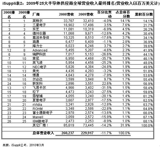 在排名前25的半導體供應商中,受創最嚴重的是索尼和飛思卡爾,2009年營業收入下降了30%以上。索尼在消費電子市場的困難處境拖累其營業收入,而飛思卡爾的營業收入則因退出手機市場而受到打擊。