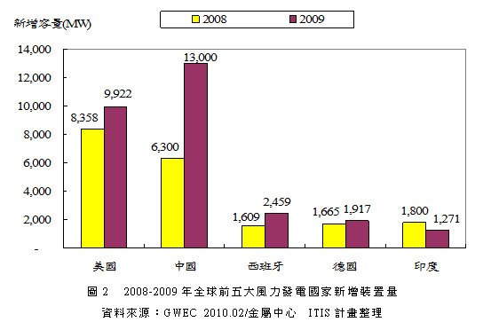 2009年全球風力發(fā)電市場不畏金融海嘯沖擊,在美國及中國政府大力推廣下,新增風力發(fā)電裝置量仍較2008年成長31%。但因2009年新增容量主要來自既有存貨,風力機接訂單量僅為15,717MW,較2008年衰退41%。前瞻2010年,在中、美及歐洲風電大國帶動下,全球風力發(fā)電新增容量將較2009年成長15%;而風力機接單量受到價格驟降及主要風電大國景氣回升影響,可望庫存回補而為2009年的2.2倍。