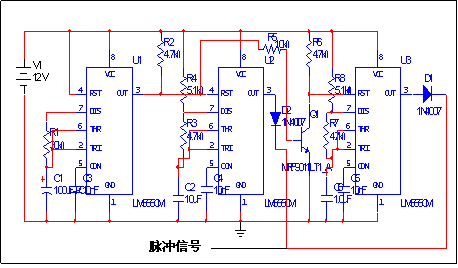 充電電路與脈沖信號結(jié)合,對電路進(jìn)行充電。這里的脈沖信號可用555定時器來實(shí)現(xiàn),用3個555來構(gòu)成一個頻率在周期變化的脈沖信號。電路圖如圖。