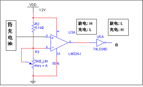 ①運(yùn)用電壓比較器監(jiān)測電池電壓,保證至充電終止電壓時,能及時關(guān)斷充電電流并鎖定“充電結(jié)束”狀態(tài)。