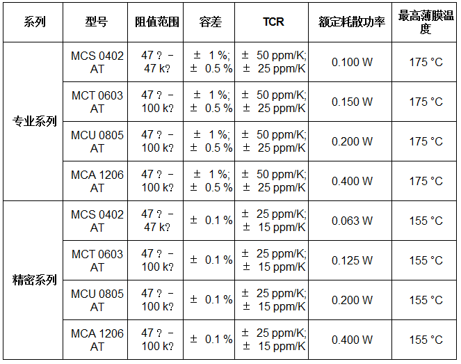 精密系列具有低至±15ppm/K的TCR和±0.1%的容差,兩個系列電阻的阻值范圍擴展至47Ω。