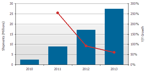 隨著主要電視品牌廠商開始在商場銷售3D電視及有愈來愈多關于3D產品計劃的進行,DisplaySearch將2010年3D電視出貨量提高到250萬臺,同時3年后3D電視市場將會有非常驚人的發展,預估到2013年將超過2千7百萬臺出貨。圖一為2010到2013年間3D電視出貨量預測。
