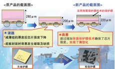 后者的封裝采用了兩項(xiàng)扁平化技術(shù)。一是改變了焊錫球的形狀。從原來(lái)的球狀改為了半球狀,高度降低了120μm。第二項(xiàng)是封裝背面的保護(hù)膜技術(shù)。將Si部分的高度比原產(chǎn)品降低80μm,并為確保強(qiáng)度而在背面粘貼了20μm的保護(hù)膜。這減少了60μm的高度。兩項(xiàng)技術(shù)加起來(lái),此次將高度從已有的EFC4601R的550μm降低了33%至370μm。