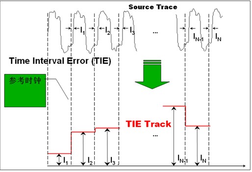 在圖2、圖3、圖4中的紅色曲線橫軸是時間,縱軸是對應周期的抖動數值,該曲線反映了抖動隨時間變化的趨勢,稱為抖動跟蹤(Jitter track);將每個周期的抖動值(比如TIE抖動的I1、I2…In)作統計直方圖,可以得到抖動直方圖(Jitter Histogram);將抖動跟蹤做快速傅立葉變換(FFT)計算可以得到抖動頻譜(Jitter Spectrum)。