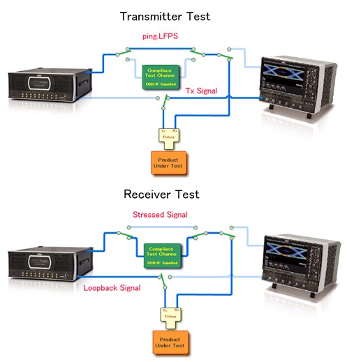 在TX測試時,信號的傳輸鏈路如圖7的上半部分所示,力科示波器通過USB電纜控制PeRT3,PeRT3通過同軸電纜向PUT的RX端發送Ping.LFPS,PUT的TX連接到示波器的通道。PeRT每發送一次Ping.LFPS,則PUT的TX發送的碼型在CP0到CP8之間切換一次(比如從CP0變為CP1,或從CP8變為CP0),這樣無需測試人員去配置PUT發送不同的測試碼型了,通過PeRT3,力科的QualiPHY軟件會自動控制PUT發送不同的測試碼型,完成TX的所有測試。