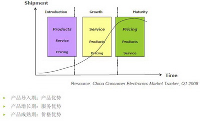 對(duì)原廠來說,市場(chǎng)開發(fā)策略會(huì)隨著產(chǎn)品的不同生命周期而發(fā)生變化。在產(chǎn)品導(dǎo)入期,產(chǎn)品的優(yōu)勢(shì)最為突出,此時(shí)穩(wěn)定產(chǎn)品性能和表現(xiàn)最重要,在產(chǎn)品增長(zhǎng)期,競(jìng)爭(zhēng)漸多,客戶的要求也開始提高,產(chǎn)品本身的優(yōu)勢(shì)可能最多3月甚至1個(gè)月就被競(jìng)爭(zhēng)對(duì)手追趕或超過。在產(chǎn)品增長(zhǎng)期末端和產(chǎn)品成熟期,市場(chǎng)差異化的空間已經(jīng)不大,上下游趨于集中,此時(shí)原廠經(jīng)過激烈競(jìng)爭(zhēng)后已經(jīng)只剩幾家寡頭,市場(chǎng)進(jìn)入拼價(jià)格的階段,這個(gè)時(shí)候,價(jià)格決定一切,原廠開始突出價(jià)格優(yōu)勢(shì)。