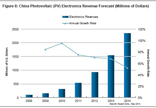 隨著政府補貼計劃在2010年達到頂點,光伏電子市場也將同時觸頂。盡管預(yù)計接下來三年年增長率下降——除非出臺新的政策,但該市場將繼續(xù)保持一定的勢頭,足以在2014年實現(xiàn)24億美元的銷售收入。