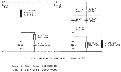 如果允許低音范圍的聲壓級低于100dB,則可使用一只口徑較小的低音單元。在這樣低的聲壓級下通常難以使低頻響應下潛到50Hz以下,但本音箱使用的Scan-Speakl5cm低/中音單元在低頻下卻能產生足夠的聲輸出并能令人滿意地重放2kHz-3kHz的聲音,這樣就不必使用中音單元了。某些口徑較小的低音單元設計成能在較小的音箱中令人非常滿意的重放低音,本音箱使用的低/中音單元就是一個很好的例證。