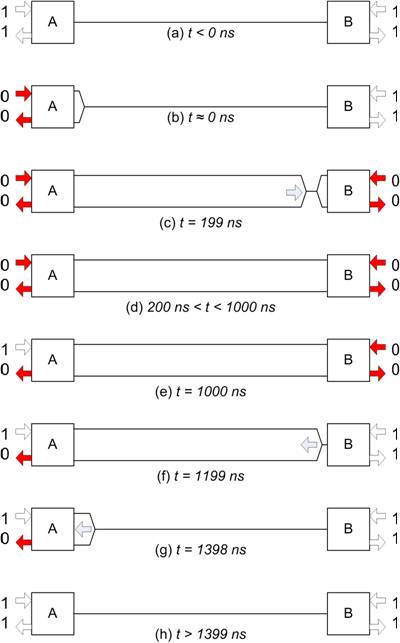 通過研究某個具有實際延遲值的假設案例,我們可以更加具體地介紹這些計時要求。在我們的二節點例子中,設定總單向延遲為200ns,信號傳輸速率為1Mbps,也就是ISO11898-2標準規定的最大值。這樣,位時間便為1000ns。除節點B的第二位會是同節點A的消息優先級匹配的0(非占用)以外,其同情況2所述一樣。(情況2中,節點B具有一個占用第二位,表明更高的消息優先級。)