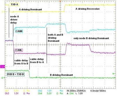 CAN標準規定,線纜為5ns每米傳輸延遲,1Mbps信號速率時最大線纜長度為40米。位時間為1000ns時,最遲采樣點(由PROP_SEG設定)約為850ns。線纜本身具有200ns的單向延遲(即400ns雙向延遲),從而使收發器和相關電路的總延遲只剩約450ns。