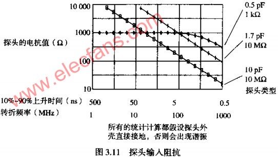 參見圖3.11,在我們關注的上升時間范圍內,探頭的并聯(lián)電容越高,阻抗會越低。在高頻時,只有并聯(lián)電容比較重要。
