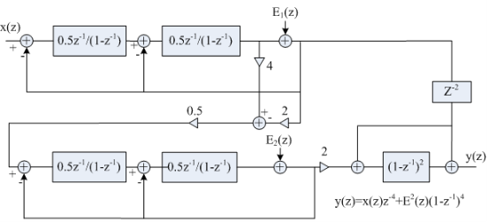圖1:Casecode結構四階Σ-Δ調制器Z域模型。