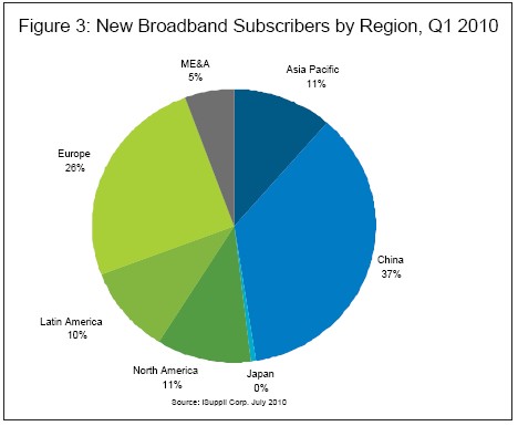 圖3所示為iSuppli公司對2010年第一季度寬帶用戶增長情況的預估,按地區細分。