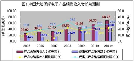 據統計分析,2009年中國大陸醫療電子本地產品銷售額比2008年增長18%,接近47億美元,其中便攜式醫療電子銷售額同比增長19%,達到27.38億美元。預計2010年醫療電子銷售額將繼續高速增長,超過56億美元。其中便攜式醫療電子產品銷售額可超過34億美元。從2005~2009年中國大陸醫療電子產品總銷售額的年復合增長率達15.9%,其中便攜式產品的年復合增長率達23.5%(見下圖)。