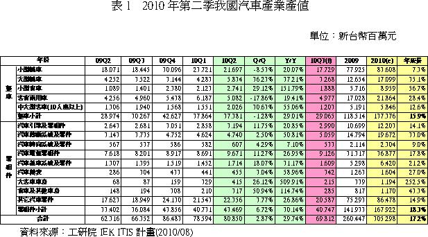 - 2010年第二季汽車產業總產值808.5億元新臺幣