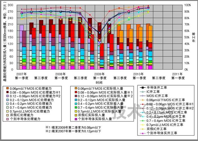 日前,國際半導體產能統計(SICAS)2010年第二季度(4~6月)的半導體產能公布。雖然部分半導體廠商已經開始了增產投資,但因老生產線廢棄,晶圓處理能力未能大幅提高。在這種情況下,由于晶圓投入量增加,半導體的整體開工率達到了可以說是滿負荷的95%以上。一部分甚至超過了98%,呈 “超滿負荷運轉”狀態。