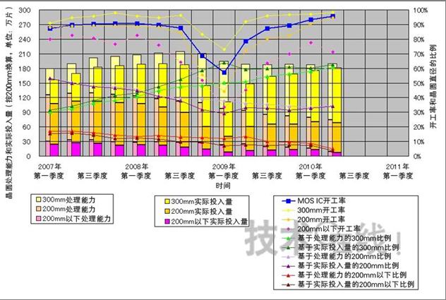 晶圓的實際投入量方面,除部分特例外,均持續了YoY增20~30%、QoQ增近10%的增長率。其中,從半導體廠商的企業形態來看,硅代工廠商的增長率比較顯著,而從工藝技術來看,60nm以下工藝的增長率較為顯著。硅代工廠商的投入量為YoY增67.8%,QoQ增10.6%,達到40萬2200 片/周(以200mm晶圓換算,下同)。60nm以下工藝晶圓的投入量為QoQ增13.0%,達到78萬500片/周。