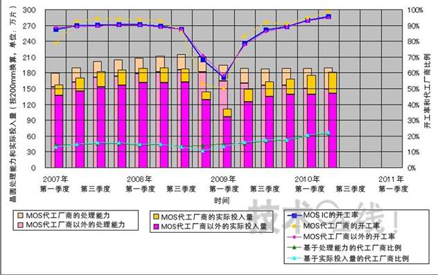 綜上所述,半導體整體的量產線開工率為YoY增18.6個百分點,QoQ增2.1個百分點,達到95.6%,MOS IC整體為YoY增17.1個百分點,QoQ增長2.5個百分點,達到95.7%,均超過了95%。尤其是需求量較大的80nm以下工藝、300mm晶圓以及硅代工廠商的開工率更是達到了超過98%的“超滿負荷運轉”狀態。