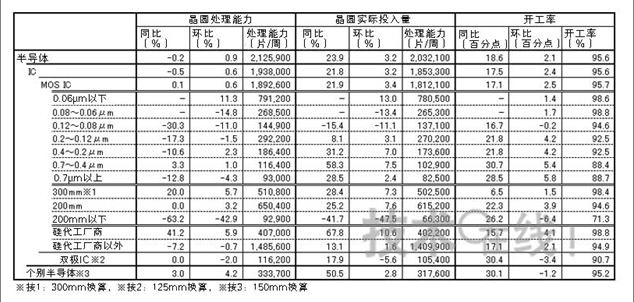 晶圓處理能力方面,半導體整體為同比(YoY)減少0.2%,環比(QoQ)增長0.6%,MOS IC整體為同比增長0.1%,環比增長0.6%,繼續持平。旨在從0.12~0.06μm生產線向0.06μm以下生產線過渡的細微化投資十分活躍,但是為擴大晶圓處理能力的增產投資卻稍顯遜色:其沖抵了老生產線廢棄導致的晶圓處理能力下降。增產投資的實施,從半導體廠商的企業形態看,主要是硅代工廠商,從晶圓直徑來看,主要面向300mm晶圓進行。而在硅代工廠商之外的垂直整合型半導體廠商(IDM)因進行重組,廢棄了200mm以下的量產線。