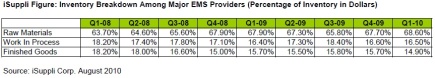 iSuppli指出,觀察全球前五大電子制造服務(EMS)的最新庫存狀況顯示,在2010年第一季,零組件與原材料占據近七成的總庫存量;相對來看,在制品(work-in-process goods)占據總庫存量的比例為17%,成品(finished goods)所占比例則低于15%。