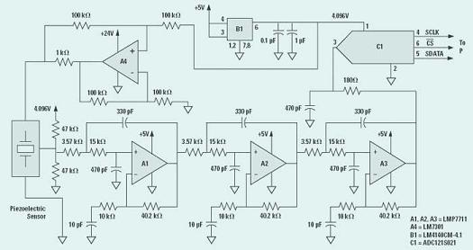ADC121S021是一款設(shè)有串行外圍接口(SPI)的12位、200kSPS單端輸入轉(zhuǎn)換器。型號(hào)為LM4140ACM-4.1的另一款高精度電壓參考電路可為這款模擬/數(shù)字轉(zhuǎn)換器提供電壓參考,并為濾波放大器提供偏壓,并設(shè)置濾波器的偏置電壓為模擬/數(shù)字轉(zhuǎn)換器輸入電壓范圍的一半。傳感器的輸出屬于交流電信號(hào),而中度的電平偏移可將信號(hào)轉(zhuǎn)移到模擬/數(shù)字轉(zhuǎn)換器輸入電壓范圍內(nèi)的中央位置。LM4140芯片也可為LM730132V通用放大器(即A4放大器)所輸出的壓控電流提供電壓參考。傳感器內(nèi)置的MOSFET可為壓電傳感電路提供緩沖。A4放大器負(fù)責(zé)輸出電流,以便驅(qū)動(dòng)組成為共源級(jí)放大器的MOSFET,而有關(guān)晶體管則通過交流耦合與輸出終端裝置連接在一起。