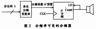 因此若采用模值和輸入脈沖頻率都可控的計數(shù)器實現(xiàn)信號分頻,可根據(jù)音程碼選擇分頻計數(shù)器的輸入脈沖頻率fs、根據(jù)音名碼控制分頻計數(shù)器的模值N,如圖2所示。