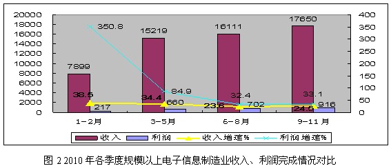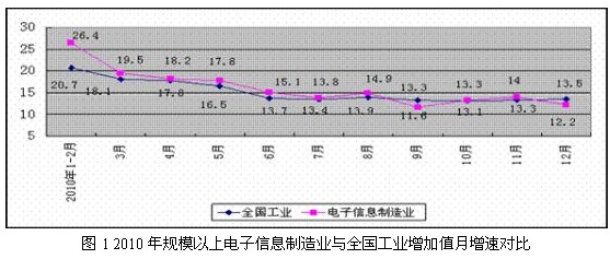 2010年是“十一五”規(guī)劃收官之年,也是我國電子信息產業(yè)回升調整的重要一年,受擴內需政策成效顯現(xiàn)和外需市場逐步回暖的共同作用,行業(yè)出現(xiàn)恢復性增長,總體呈現(xiàn)前高后穩(wěn)態(tài)勢。軟件產業(yè)和對外貿易出現(xiàn)新突破,經濟效益穩(wěn)步提高,投資持續(xù)高位增長,產品結構調整深入,產業(yè)鏈向上延伸的趨勢更加明 顯,企業(yè)、市場和區(qū)位布局出現(xiàn)新趨向,行業(yè)為推動信息化發(fā)展和促進兩化融合發(fā)揮積極作用,在國民經濟發(fā)展和全球產業(yè)布局中日益占據重要地位。