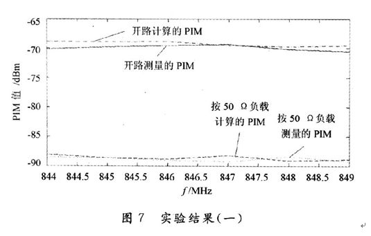 為了驗(yàn)證該方法的有效性,本文給出了兩個(gè)頻段的PIM值的計(jì)算與測量結(jié)果對比。頻段l:800 MHz的通信系統(tǒng)的發(fā)射頻段為869~894 MHz,接收頻段為824~849 MHz。如圖7所示。