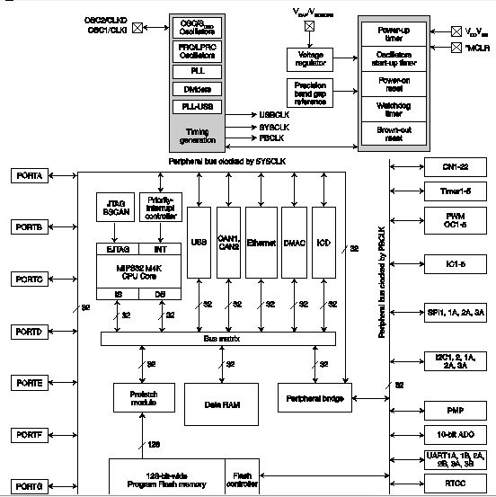 另外,不要忽視那些可能導致嚴重預算問題的膠合邏輯,如看門狗定時器、低電壓檢測、電壓整流器、主時鐘/外設時鐘/實時時鐘等。這些功能的集成,使PIC32 系列成為真正適用于“控制”應用的芯片,有別于“計算機”芯片。