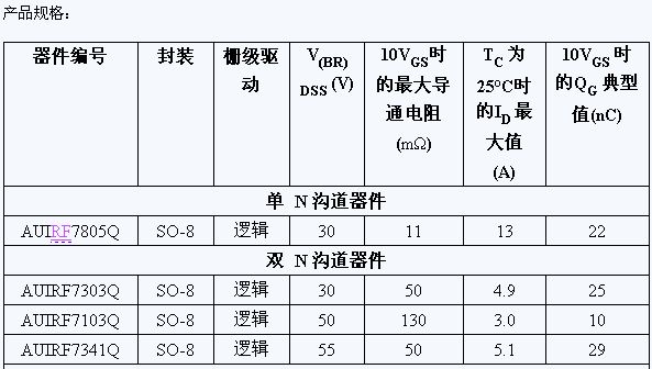 IR 亞太區銷售副總裁潘大偉表示:“由于可以滿足寬泛電壓的要求并采用 SO-8 封裝和 IR 的平面技術,我們的最新系列 MOSFET 可以提供堅固緊湊的解決方案,非常適合需要用堅固 MOSFET 驅動阻性和感性負載的應用。”