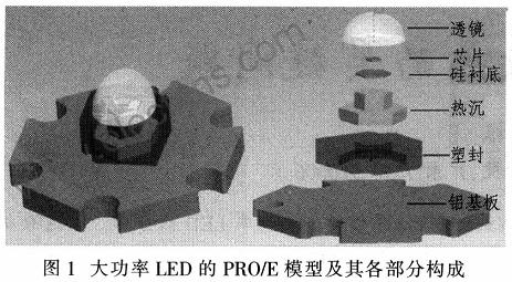 圖1為依據(jù)常見1w大功率LED尺寸建立并簡(jiǎn)化、海鷗翼封裝鋁熱沉的大功率LED圖形,底座接在MCPCB鋁基板上。主要數(shù)據(jù):芯片尺寸為1mm×1mm×O.25mm,透鏡為直徑是13mm的半球。硅襯底為邊長(zhǎng)17mm,高0.25mm的正六棱柱,MCPCB為直徑20mm,高1.75mm的六角星形鋁質(zhì)基板。