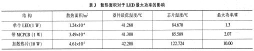 表3為3種不同散熱方式對(duì)LED的溫度分布、最大功率的影響。可以看出,增加散熱面積是很好的散熱方式,可以輕易地提高LED器件散熱能力,這是目前LED產(chǎn)品所普遍使用的散熱方式之一。然而缺點(diǎn)也很明顯:影響成本、增加產(chǎn)品重量、影響封裝密度。無限度地提高LED散熱片面積顯然不現(xiàn)實(shí),因此一般使用1.5inch2散熱片提升LED產(chǎn)品最大功率至10W左右,出于成本等因素就不能繼續(xù)提高。