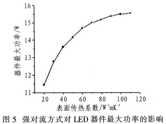 常見對(duì)流散熱方式有兩種:自然對(duì)流和強(qiáng)制對(duì)流。固定結(jié)構(gòu)的散熱與表面?zhèn)鳠嵯禂?shù)有關(guān)。空冷方式時(shí),不同傳熱系數(shù)對(duì)最大功率的影響如圖5所示。強(qiáng)對(duì)流方式在一定速度內(nèi)會(huì)大大提高LED產(chǎn)品的散熱能力,有助于提高散熱效果。