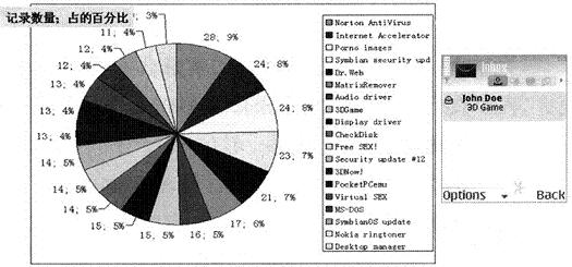 當(dāng)用戶打開(kāi)含有CommWarrior病毒的MMS消息后,該病毒將在手機(jī)中進(jìn)行安裝,并開(kāi)始向手機(jī)號(hào)碼薄中的用戶隨機(jī)發(fā)送含有自身拷貝的MMS消息。同時(shí),CommWarrior會(huì)偽造彩信主題進(jìn)行傳播,通常包含著這樣的內(nèi)容“來(lái)自我的3D游戲!免費(fèi)!”以及“適合所有型號(hào)諾基亞手機(jī)的鈴聲”等,使得接受彩信的用戶不會(huì)引起警覺(jué),具體各類的消息內(nèi)容的比例如圖2所示。