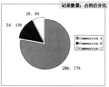 通過(guò)GPRS核心網(wǎng)抓包分析,目前用戶感染的彩信病毒類型主要是CommWarrior病毒,A,B,C分別是其的變種類型,具體感染的比例參見(jiàn)圖3。